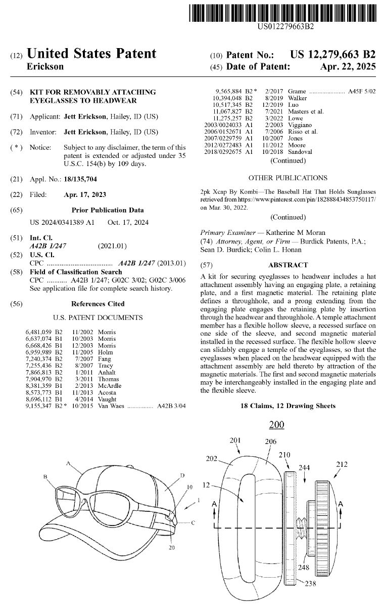 Ever lose your expensive sunglasses after perching them on the bill of your baseball cap? Inventor Jett Erickson solved that problem with this specialized kit for magnetically attaching eyeglasses to headwear. One magnet rests in a hollow sleeve that slides onto each temple of the sunglasses, and another magnet is pinned to each side of the rim of the baseball cap. Simply slide your sunglasses onto the visor and lock them into place! Total pendency: two years and five days.