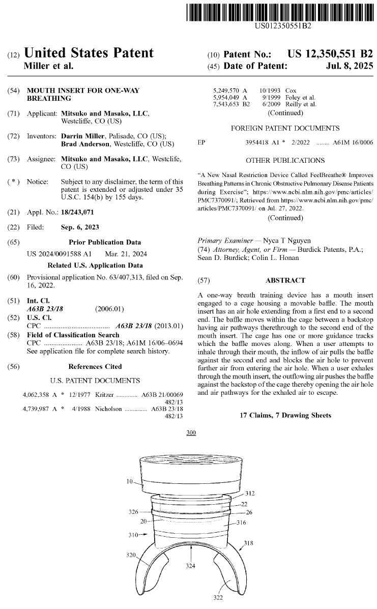 Tired of being a mouth-breather? Darrin Miller and Brad Anderson solved that problem with this hands-free training device. The moving baffle blocks the airway when you inhale by mouth, forcing you to breathe through your nose. Repeated training reteaches you to nose-breathe while you’re awake and can also improve your sleep by preventing you from snoring. Time from filing to issuance: 22 months.