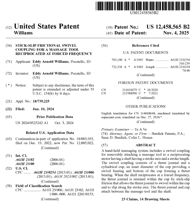 Think you can’t patent a round peg in a round hole? Eddy A. Williams proved it was possible when his U.S. Patent 12,458,565 for a swivel coupling was granted late last year. Ed’s invention advances the science of “stick slip friction” — the same phenomenon that governs the mechanics of a bow dragged across violin strings — by applying its principles to a motorized massage tool to more accurately simulate the “tapotement” technique of human hands. Time from filing to issuance: 512 days.